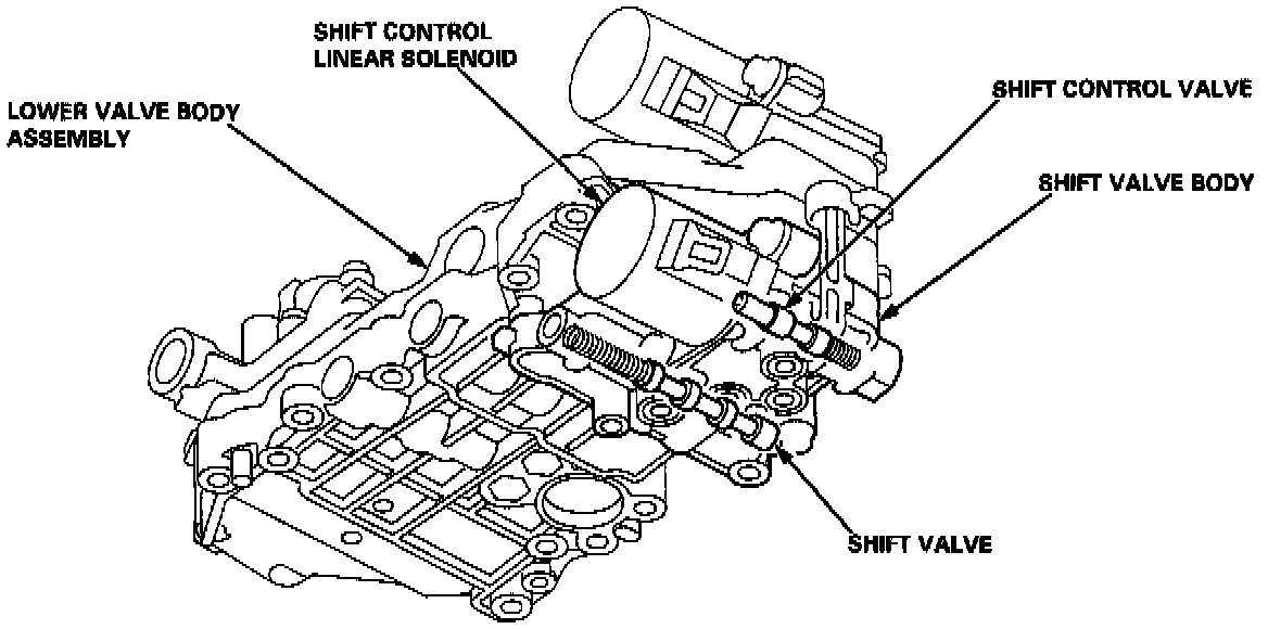 The shift valve body contains the shift valve and the shift control valve. Both are joined to the shift control linear solenoid.