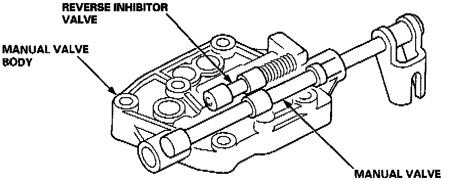 The manual valve body contains the manual valve and the reverse inhibitor valve. The manual valve body is bolted to the intermediate housing.