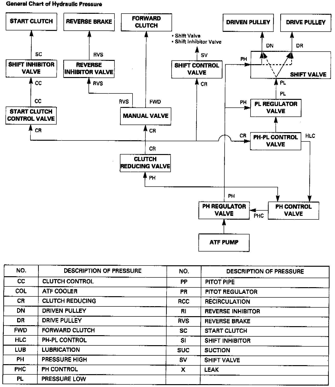 The flow of fluid up to the drive pulley, the driven pulley, and the clutch reducing valve is the same as in [N] position. The pulley ratio is low because the driven pulley receives High Pressure (PH), and the drive pulley receives Low Pressure (PL). The Clutch Reducing pressure (CR) flows through the manual valve to the forward clutch, then forward clutch is engaged. The forward clutch then drives the drive pulley shaft, which drives the driven pulley shaft. Also, clutch reducing pressure (CR) flows to the start clutch control valve, and becomes Clutch Control pressure (CC). Clutch control pressure (CC) becomes Start Clutch pressure (SC) at the shift inhibitor valve. Start clutch pressure (SC) is applied to the start clutch to engage the start clutch.