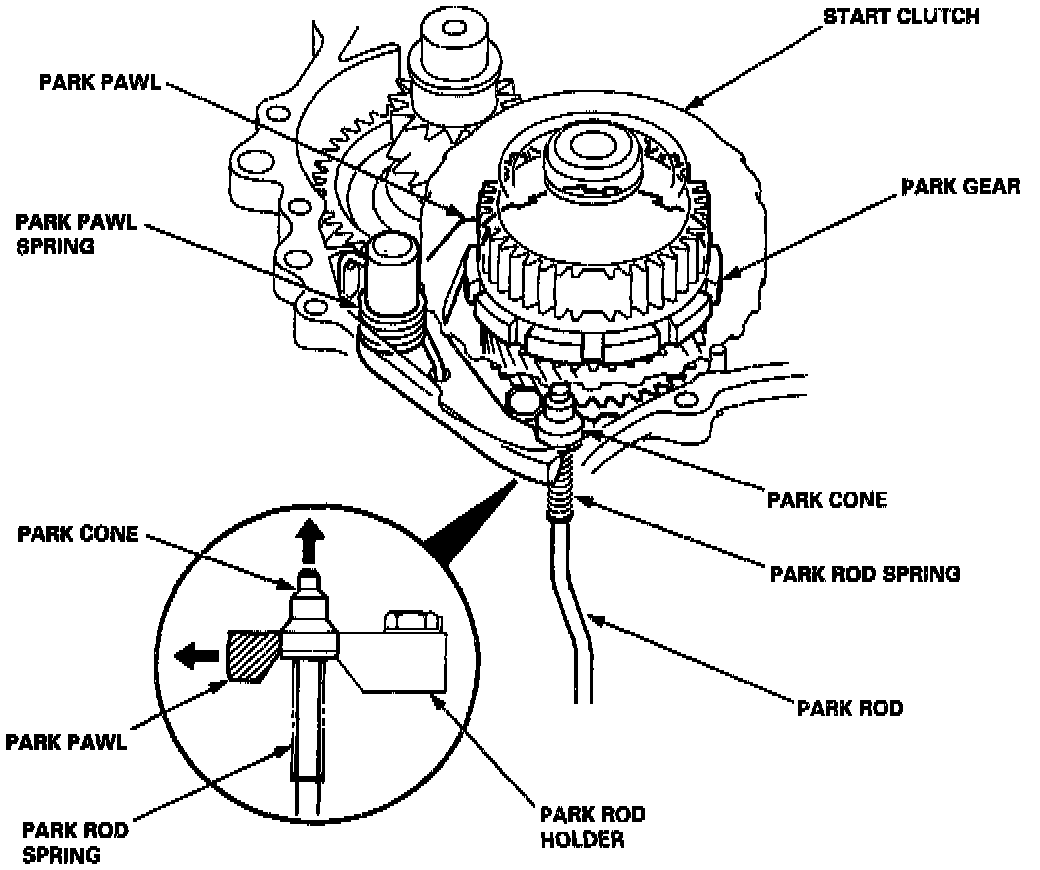 Shifting to [P] position causes the park cone (installed at the end of the park rod) to press the park pawl onto the park gear. Even if the end of the park pawl rides on the top of the park gear teeth, slight movement of the vehicle will cause the park pawl and the park gear to mesh with each other completely because the park cone receives the tension from the park rod spring. The park pawl receives the tension (which acts to separate the park pawl from the park gear) from the park pawl spring.