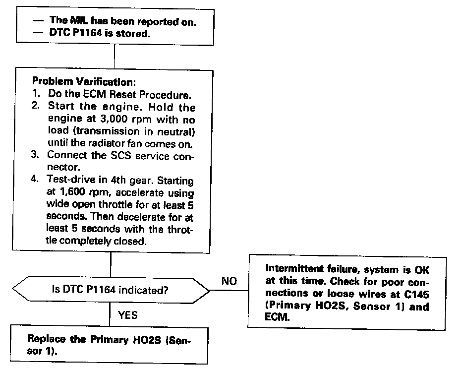 The scan tool indicates Diagnostic Trouble Code (DTC) P1164: A range/performance problem in the Primary Heated Oxygen Sensor (Primary HO2S) (Sensor 1) circuit.