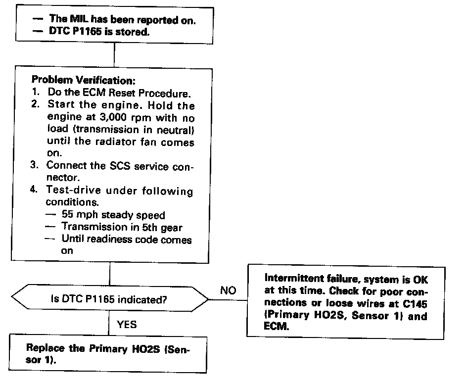 The scan tool indicates Diagnostic Trouble Code (DTC) P1165: A range/performance problem the Primary Heated Oxygen Sensor (Primary HO2S) (Sensor 1) circuit.