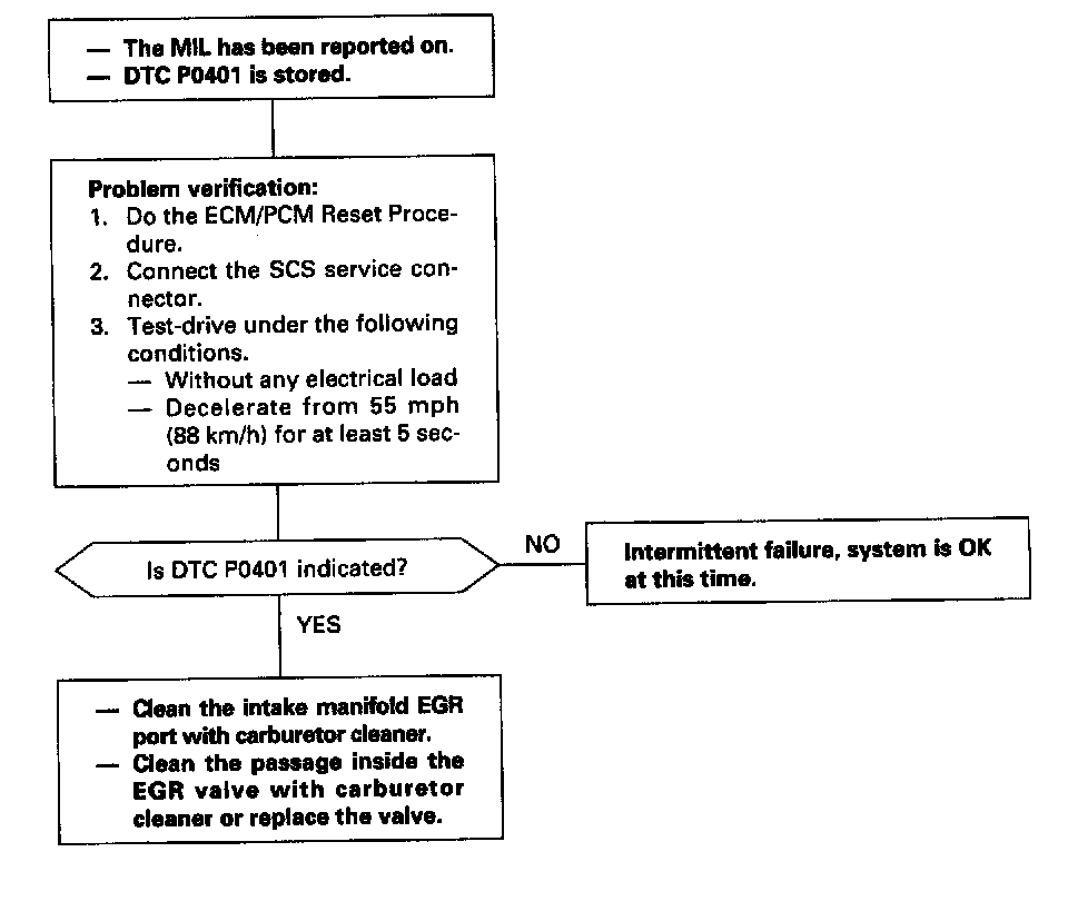 If deterioration has been detected during two consecutive driving cycles, the MIL will come on and DTC P0401 will be stored.
