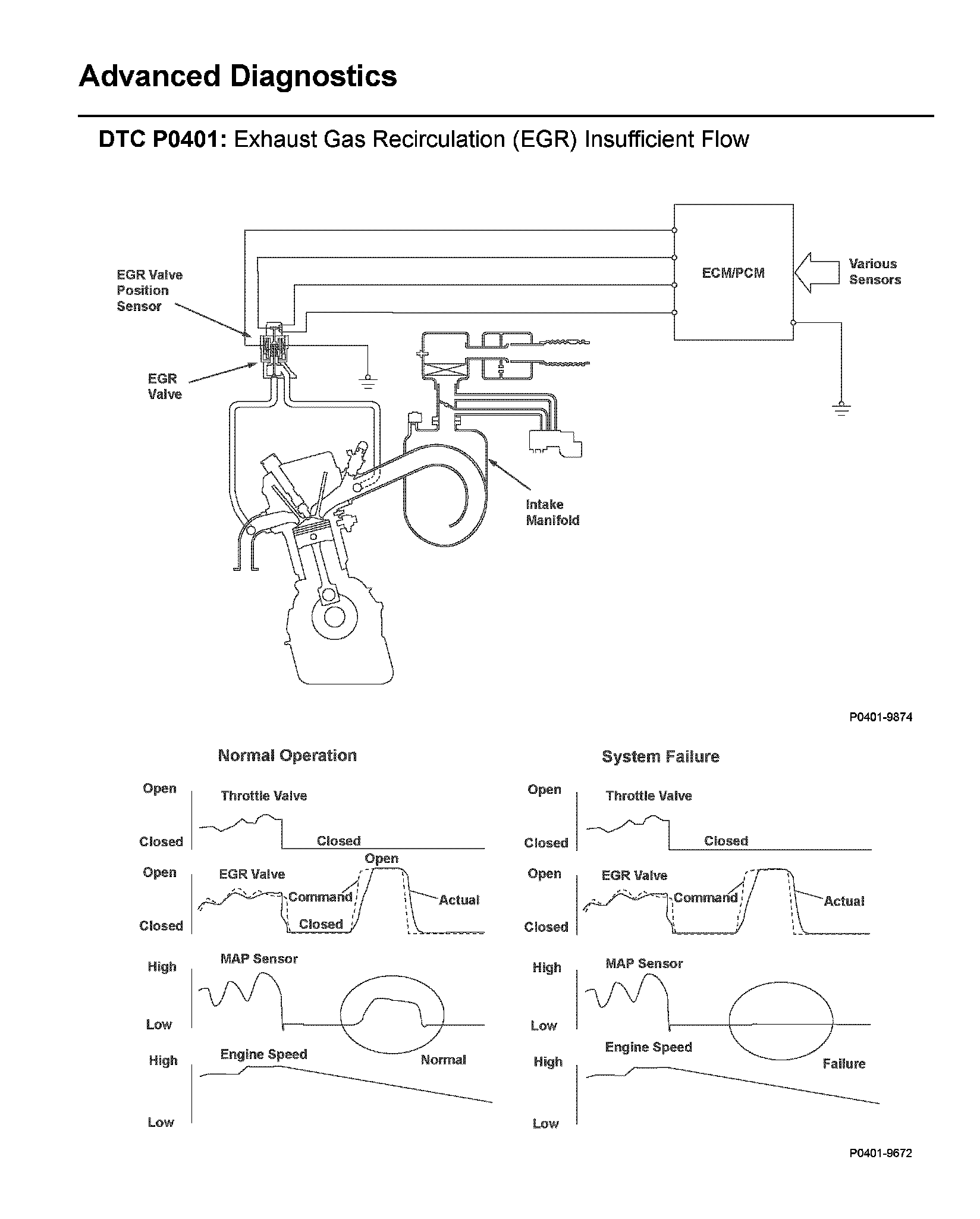 The scan tool indicates Diagnostic Trouble Code (DTC) P0401: Insufficient flow in the Exhaust Gas Recirculation (EGR) system.
