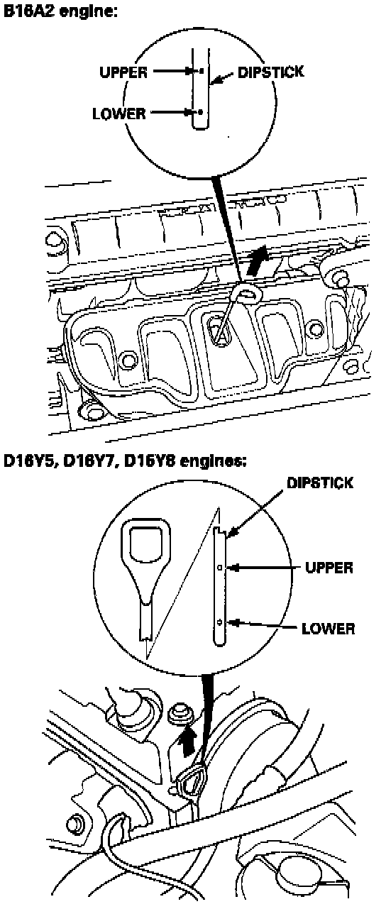 2. Make certain that the oil level indicated on the dipstick is between the upper and lower marks.