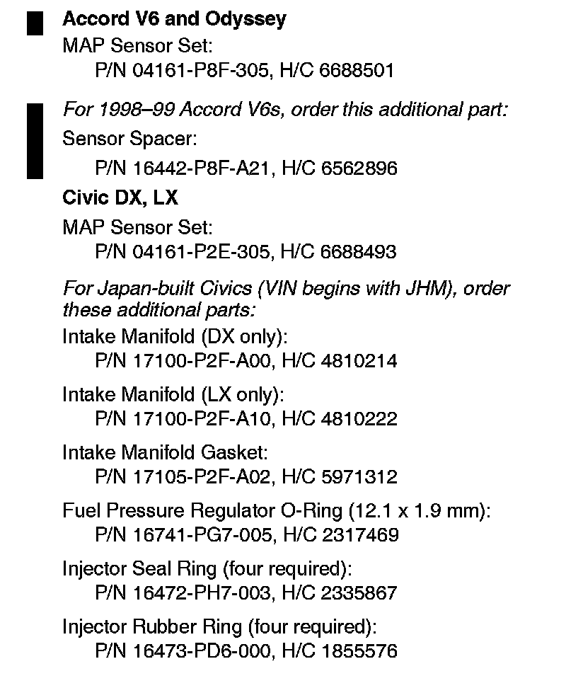 Accord V6; 1998-00 Civic DX, LX; Odyssey