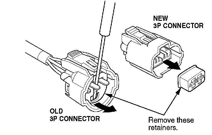 3. Use a small, flat-tip screwdriver to pry out the retainer from the 3P connector. Also, pry out the retainer from the new 3P connector.