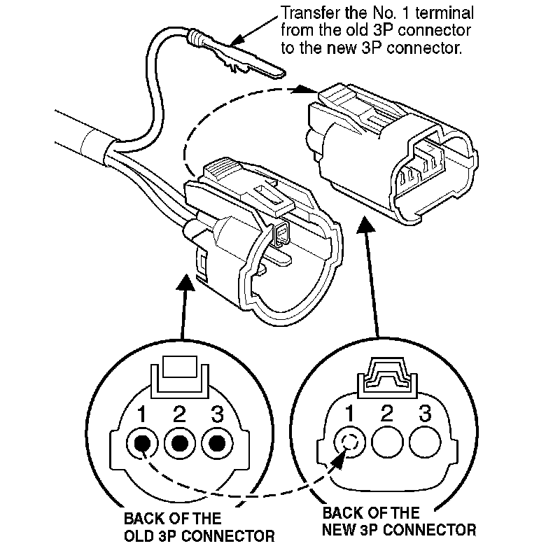 5. Repeat steps 3 and 4 to transfer the No. 2 terminal (GRN/WHT wire) to the center (No. 2) cavity of the new 3P connector. Repeat steps 3 and 4 to transfer the No. 3 terminal (RED/GRN wire) to the right (No. 3) cavity of the new 3P connector. Discard the old 3P connector.