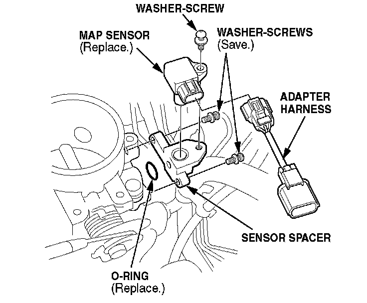 10. Install the new MAP sensor on the sensor spacer (one washer-screw). Then plug the small (black) end of the adapter harness into the sensor.