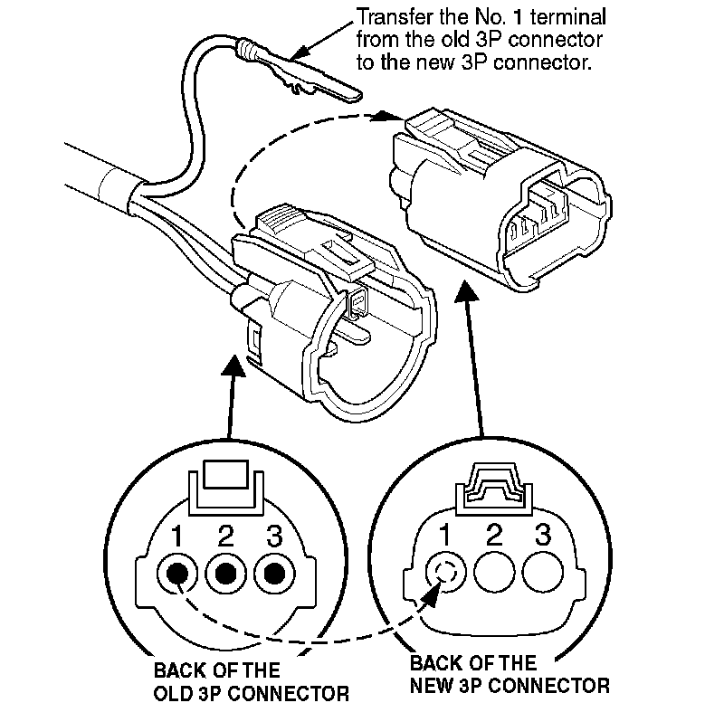 7. Repeat steps 5 and 6 to transfer the No. 2 terminal (GRN/WHT wire) to the center (No. 2) cavity of the new 3P connector. Repeat steps 5 and 6 to transfer the No. 3 terminal (RED/GRN wire) to the right (No. 3) cavity of the new 3P connector. Discard the old 3P connector.