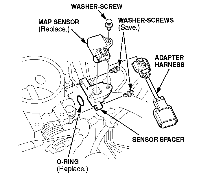 8. Remove the MAP sensor and the 0-ring from the throttle body (two washer-screws). Discard the sensor and the 0-ring, but save the washer-screws.