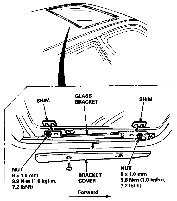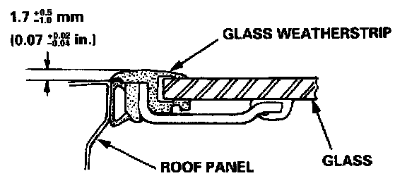 The roof panel should be even with the glass weather- strip, to within 1.7 (+0.5 mm/-1.0 mm) (0.07 (+0.02 in./-0.04 in.)) all the way around. If not, open the glass fully, and: