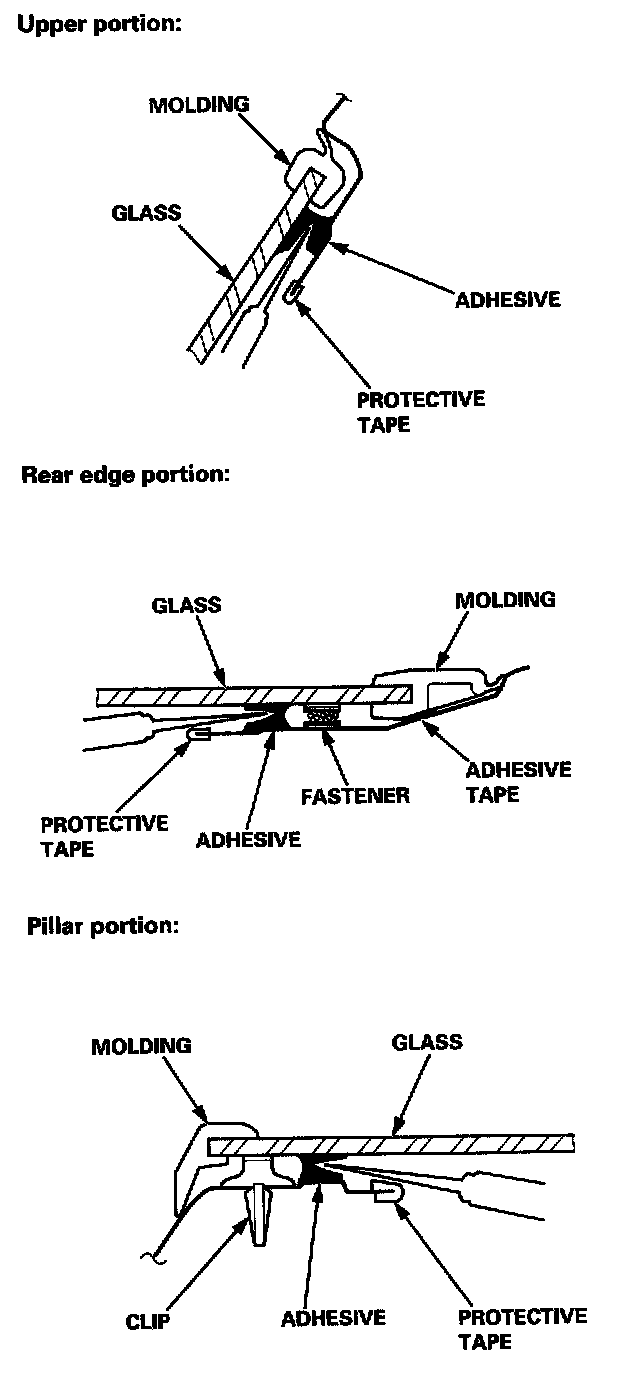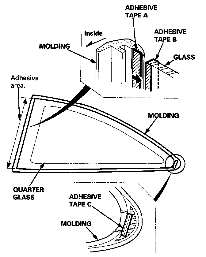 - If the old molding is to be reinstalled, scrape off the old adhesive tape from the molding, and clean the molding surface with alcohol where new adhesive tape is to be applied. Apply the double-faced adhesive tape to the molding and quarter glass as shown.