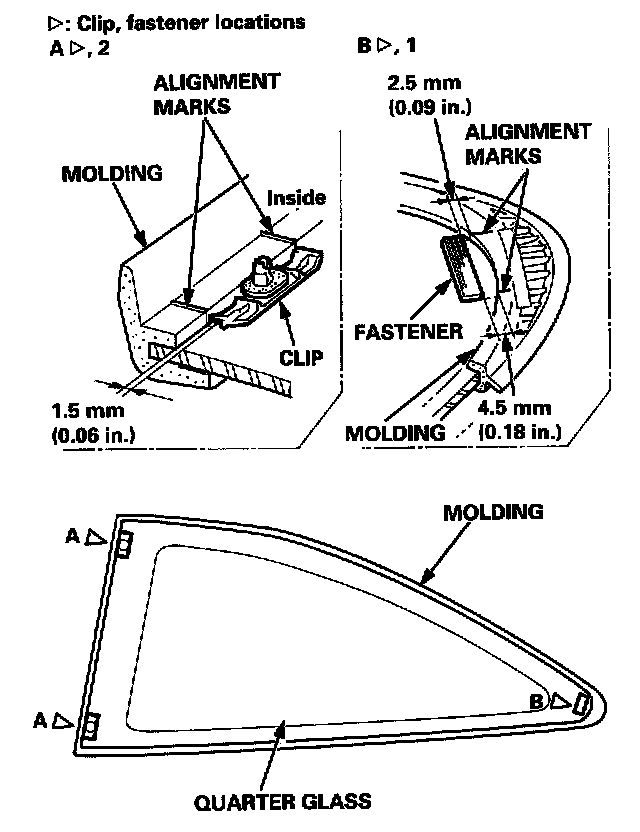 5. If the old quarter glass is to be reinstalled, glue the upper and lower clips and fastener as shown.