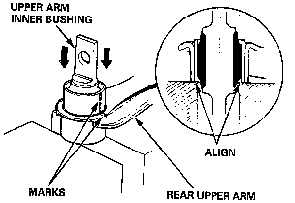 4. Drive in the upper arm inner bushing with the marks aligned.