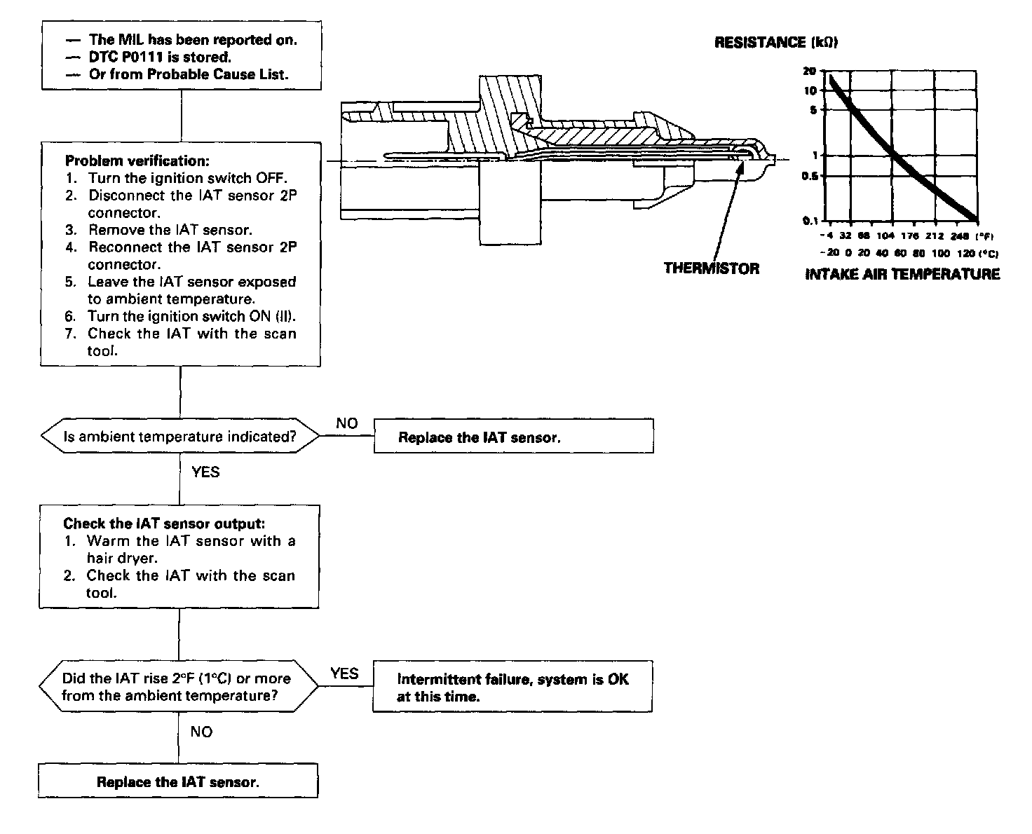 The IAT Sensor is a temperature dependant resistor (thermistor). The resistance of the thermistor decreases as the intake air temperature increases as shown.