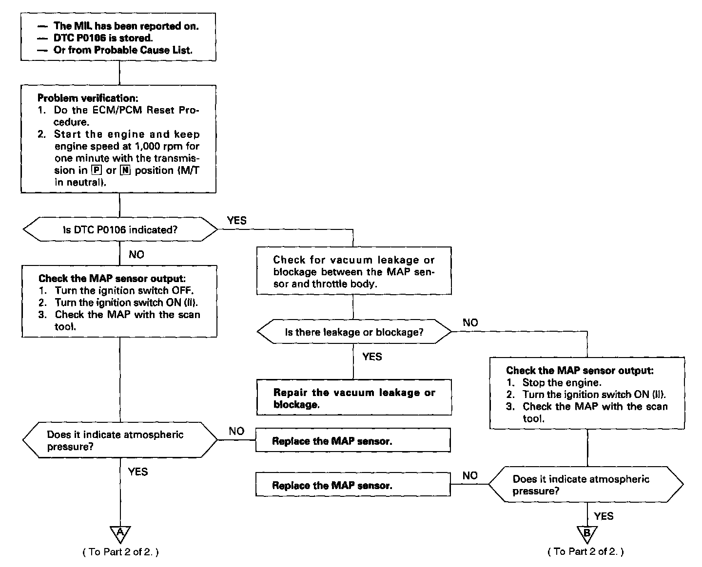 The scan tool indicates Diagnostic Trouble Code (DTC) P0106: A mechanical problem (vacuum leak) in the Manifold Absolute Pressure (MAP) Sensor system.