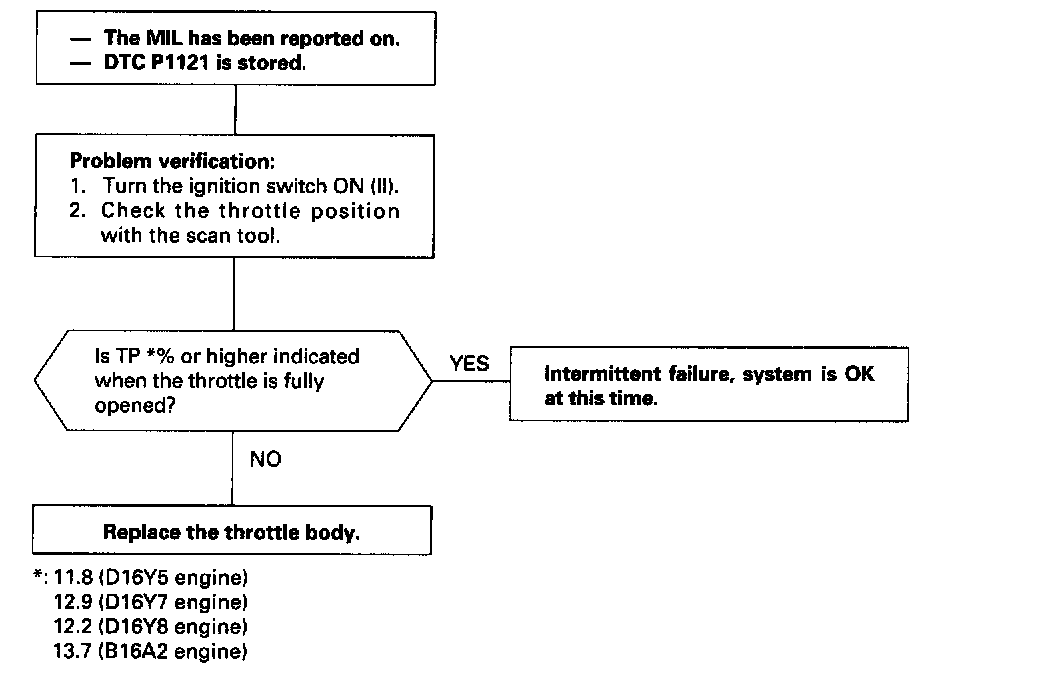 The scan tool indicates Diagnostic Trouble Code (DTC) P1121: