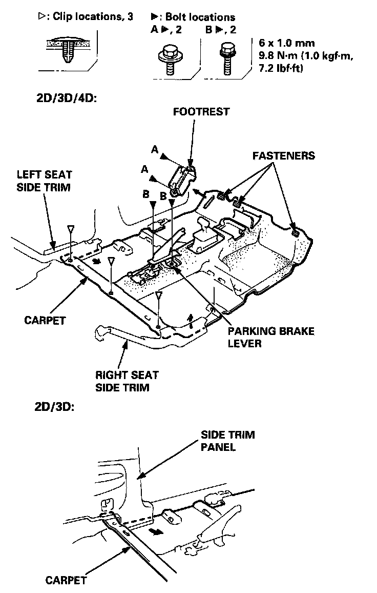 - Slip the carpet under the seat side trim 4D or side trim panel 2D/3D on each side properly.