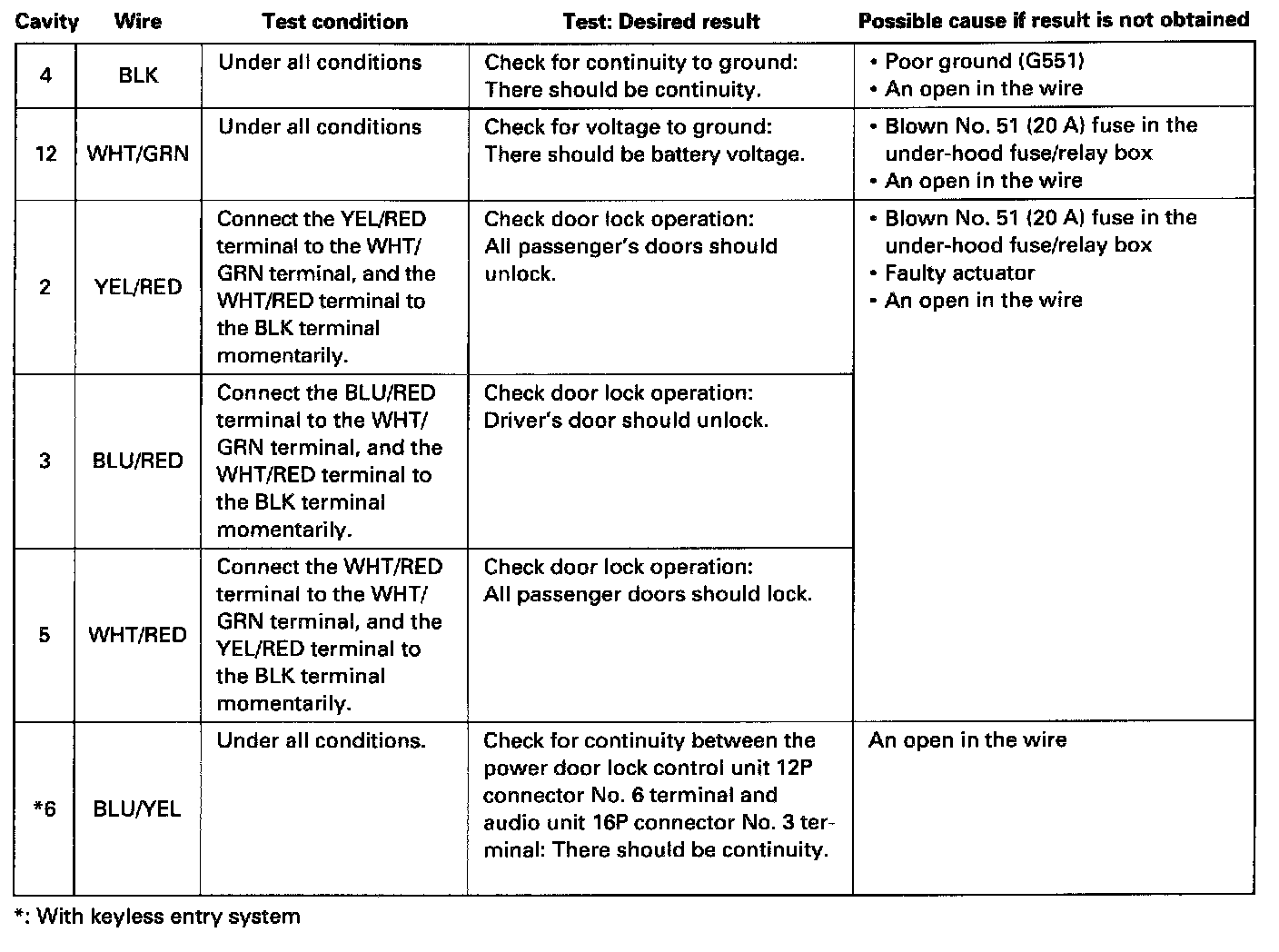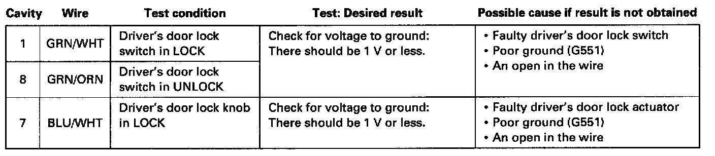- If the terminals look OK, make the input tests shown in the table at the connector.
