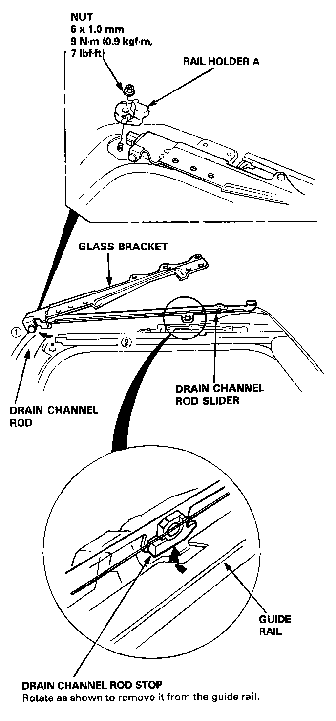 10. Remove the drain channel rod slider by moving the cable slider forward using the moonroof wrench.