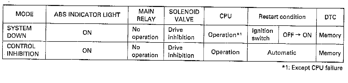 Since the anti-lock brake system modulates the braking pressure when a wheel is about to lock, regardless of the driver's intention, the system operation and the braking power will be impaired if there is a malfunction in the system. To prevent this possibility, the self-diagnosis function monitors the main system functions. The ABS control unit is equipped with a main CPU and a sub CPU The CPUs check each other and the circuits of the system. When the CPUs detect failure, they shift to the "system down mode" or the "control inhibition mode". When an abnormality is detected, the ABS indicator light goes on.
