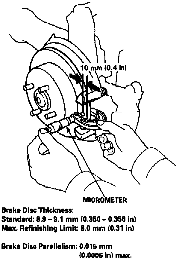5. Using a micrometer, measure disc thickness at eight points, approximately 45° apart and 10 mm (0.4 inch) in from the outer edge of the disc. Replace the brake disc if the smallest measurement is less than the max. refinishing limit.