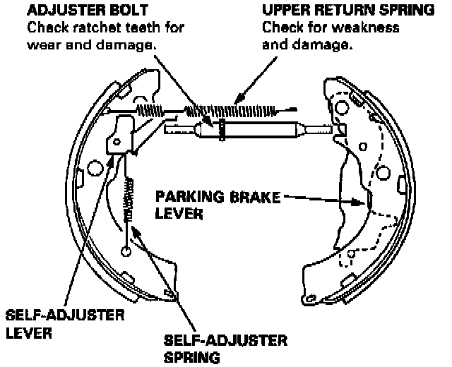 5. Remove the upper return spring, self-adjuster lever, and self-adjuster spring, and separate the brake shoes.