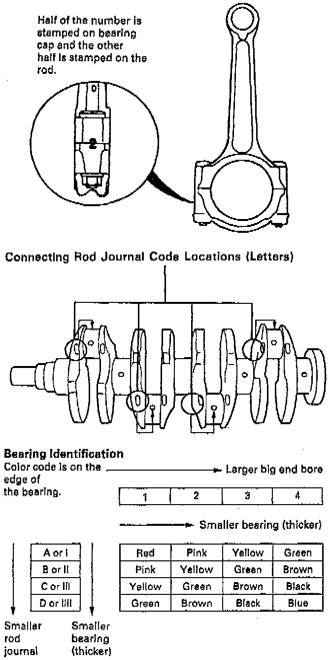 NOTE: Numbers have been stamped on the side of each connecting rod as a code for the size of the big end. Use them, and the letters stamped on the crankshaft (codes for rod journal size), to choose the correct bearings.