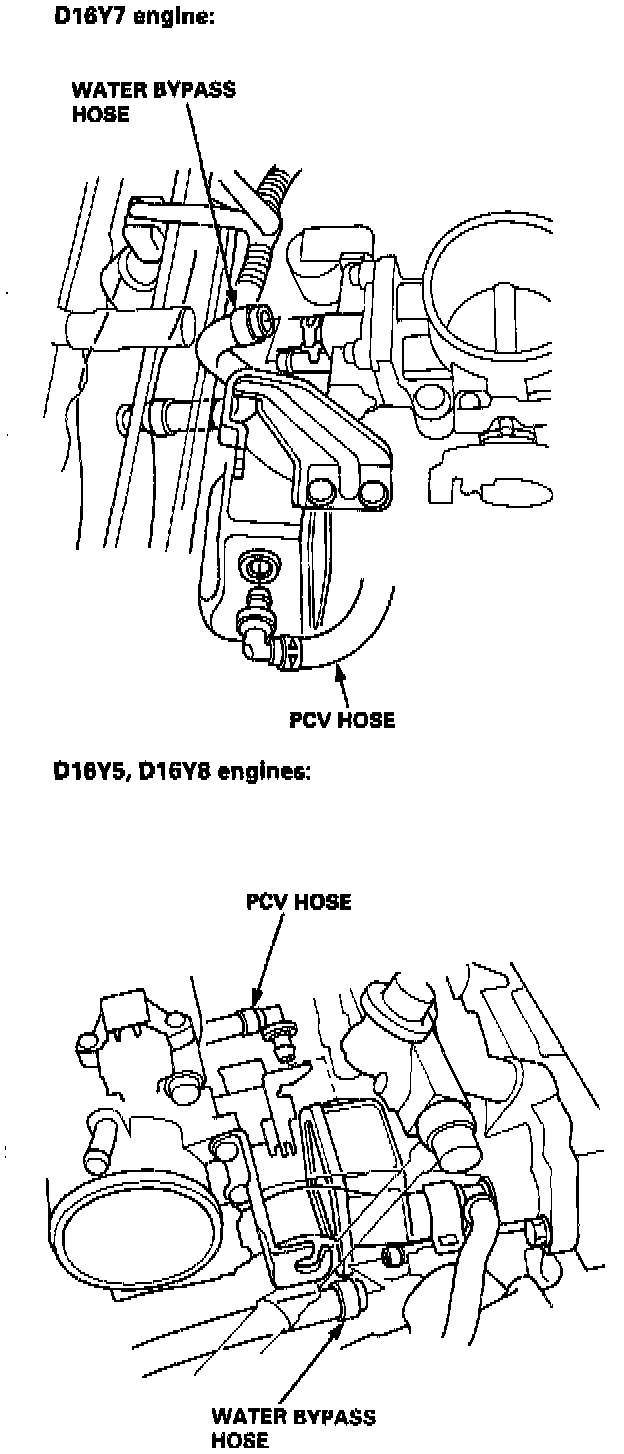 12. Remove the water bypass hose and Positive Crankcase Ventilation (PCV) hose.