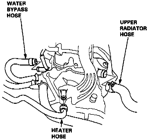 13. Remove the upper radiator hose, heater hose and water bypass hose.