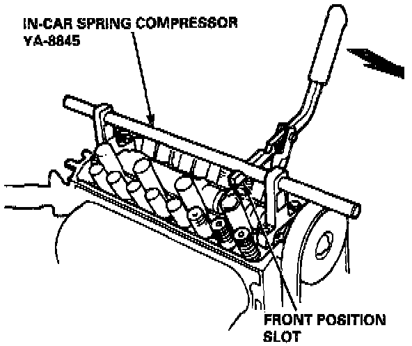 15. Position the lever arm under the cross shaft so the lever is perpendicular to the shaft and the compressor attachment rests on top of the retainer for the spring being compressed. Use the front position slot on the lever as shown.