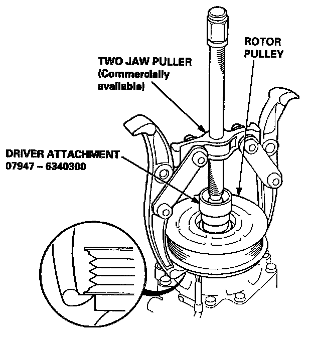 NOTE: Place the claws of the puller on the back of the rotor pulley, not on the belt area; otherwise the rotor pulley can be damaged.