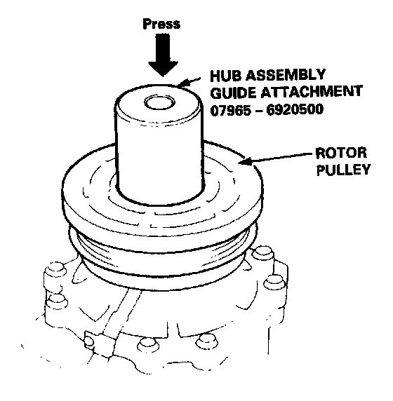 6. Position the rotor pulley squarely over the field coil. Press the rotor pulley onto the compressor boss with the special tool. If the rotor pulley does not press on straight, remove it, and check the rotor pulley and compressor boss for burrs or damage.