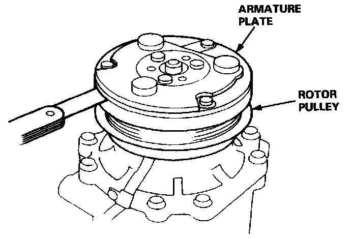 - Measure the clearance between the rotor pulley and the armature plate all the way around. If the clearance is not within specified limits, the armature plate must be removed and shims added or removed as required, following the procedure.