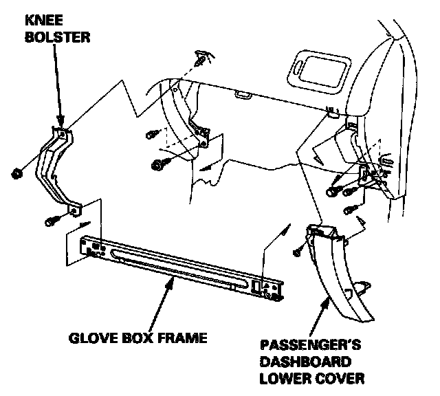 6. Remove the self-tapping screw and the passenger's dashboard lower cover. Remove the bolt, the nut and the knee bolster, then remove the five bolts and the glove box frame.