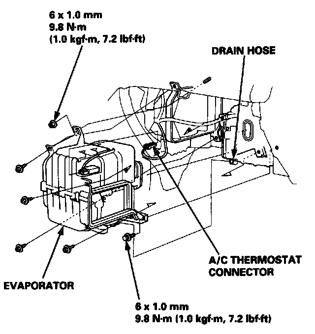7. Disconnect the connector from the A/C thermostat, and remove the wire harness from the evaporator. Remove the four self-tapping screws, the mounting bolt and the mounting nut. Disconnect the drain hose, then remove the evaporator.