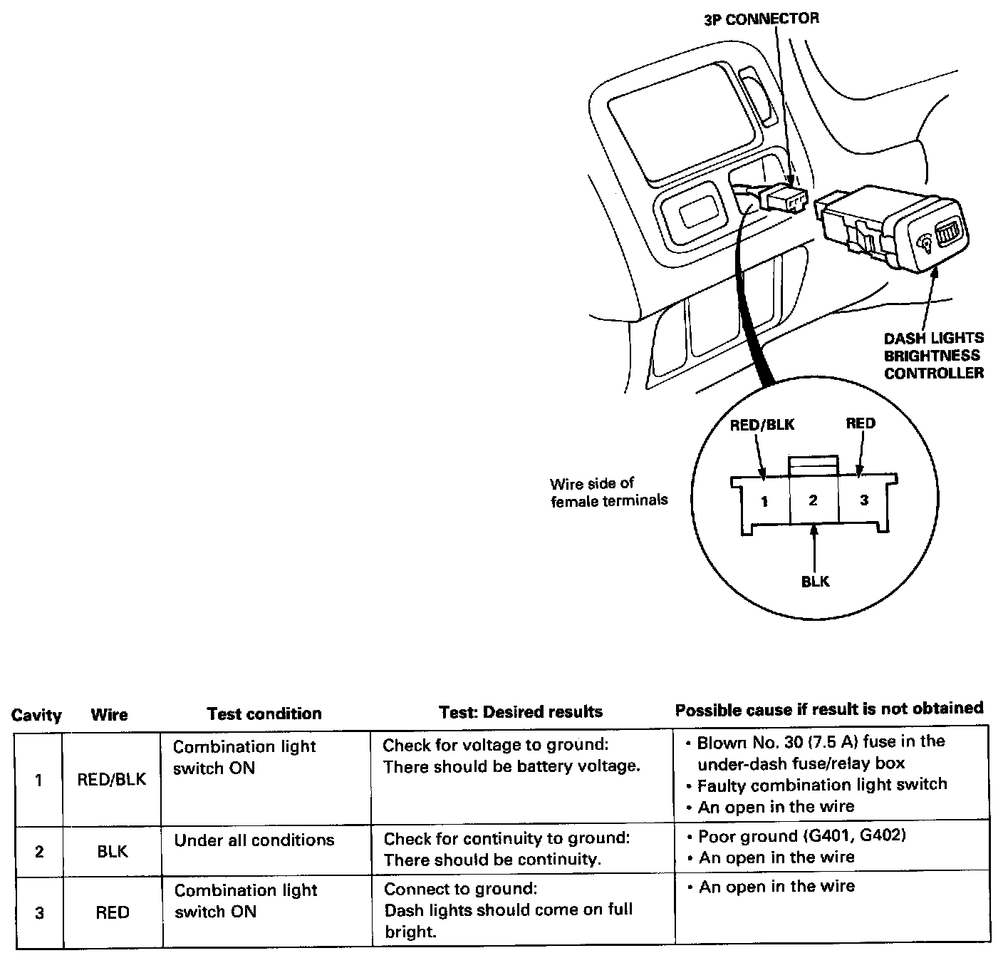 - If the terminals look OK, make the input tests shown in the table at the connector.