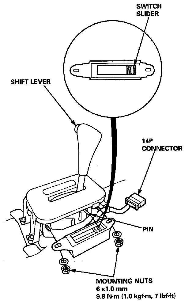 1. Remove the front console, then disconnect the 14P connector from the A/T gear position switch.2. Remove the two mounting nuts.