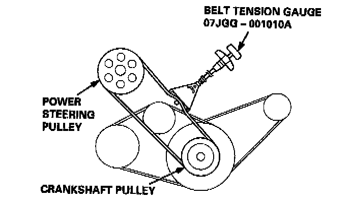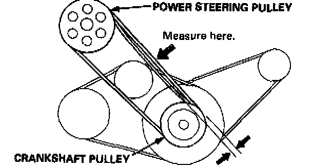 Apply a force of 98 N (10 kgf, 22 lbs.) and measure the deflection between the power steering pump and the crankshaft pulleys.