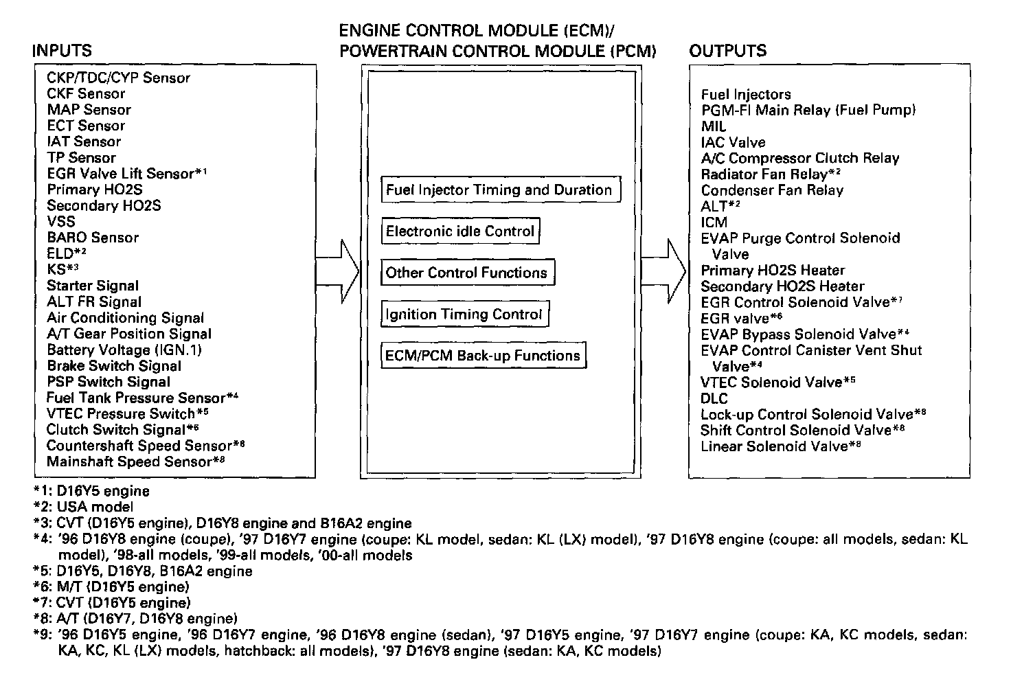 - Fuel cut-off action also takes place when engine speed exceeds 6,900 rpm (D16Y5, D16Y7 engine; D16Y8 engine:7,000 rpm, B16A2 engine: 8,100 rpm), regardless of the position of the throttle valve, to protect the engine from over-revving. With '99 D1 6Y7 engine (A/T) and '99 D16Y8 engine (A/T), the PCM cuts the fuel at engine speeds over 5,000 rpm when the vehicle is not moving.