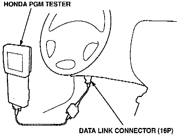 1. Wait until the engine is cool, then connect the Honda PGM Tester to the 1 6P Data Link Connector (DLC) located under the driver's side of the dashboard next to the kick panel.