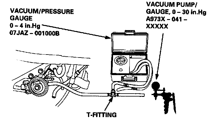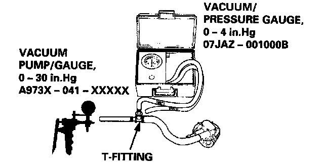 2. Remove the vapor line from the EVAP two way valve on the fuel tank, and connect it to a T-fitting from a vacuum gauge and a vacuum pump as shown.