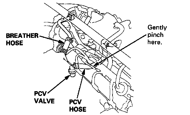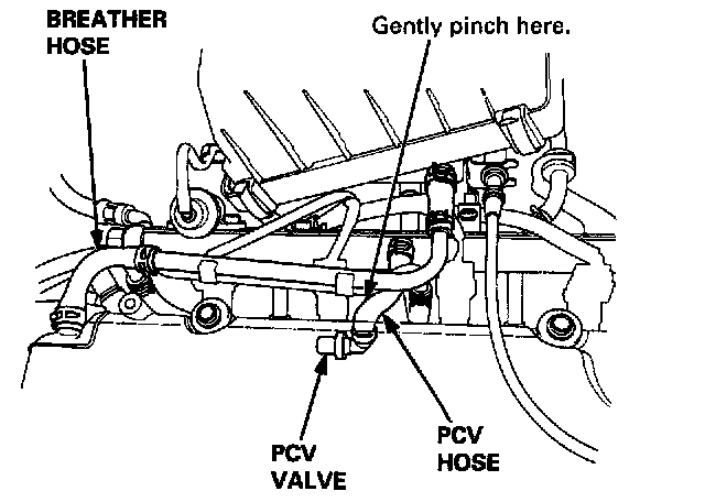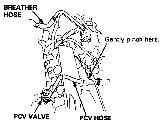 2. At idle, make sure there is a clicking sound from the PCV valve when the hose between the PCV valve and the intake manifold is lightly pinched with your fingers or pliers.
