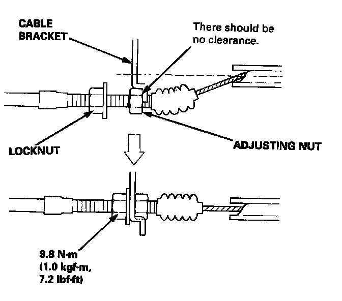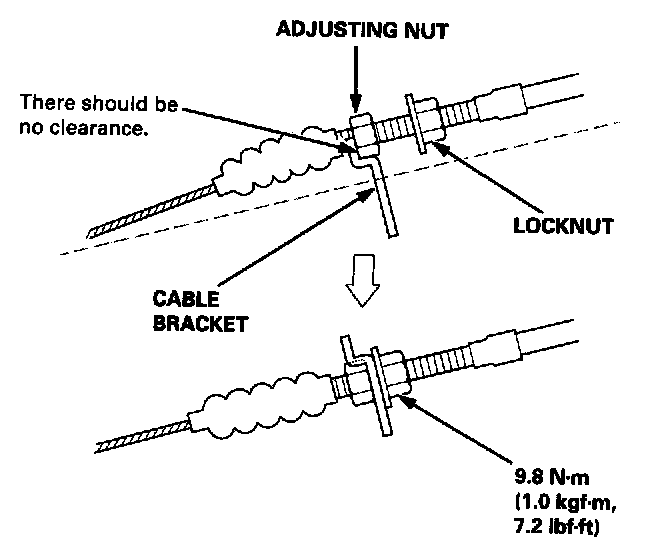 4. Set the locknut on the cable bracket. Adjust the adjusting nut so that its free play is 0 mm.