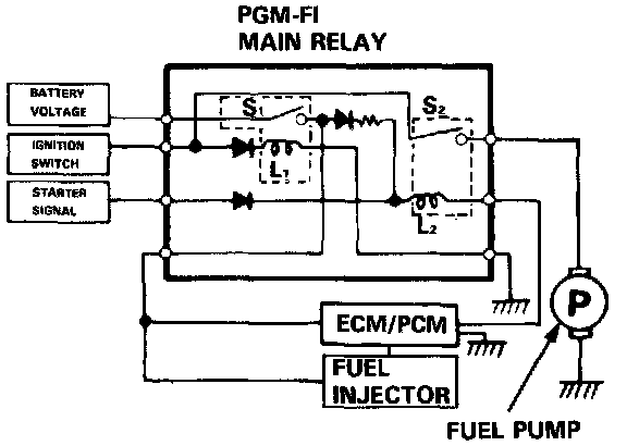 The PGM-FI main relay actually contains two individual relays. This relay is located at the right side of the cowl. One relay is energized whenever the ignition is on which supplies the battery voltage to the ECM/PCM, power to the fuel injectors, and power for the second relay. The second relay is energized for two seconds when the ignition is switched ON, and when the engine is running, to supply power to the fuel pump.