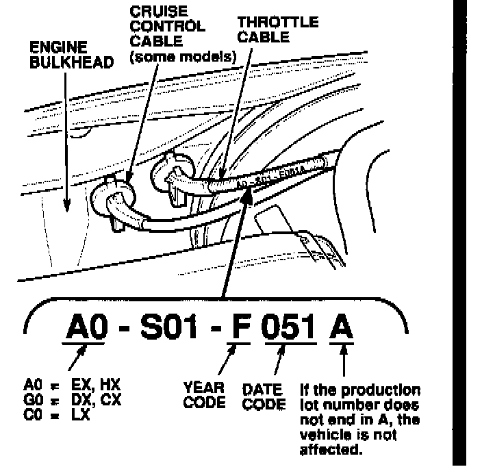 Call your local Honda dealer and make an appointment to have the car's throttle cable inspected and, if necessary, replaced. This work will be done free of charge. If your car has the original throttle cable, the dealer will replace it. If you had the throttle cable replaced under warranty, the improved part may already have been installed. The dealer will inspect the cable and, if it is not the improved part, replace it with the improved cable.