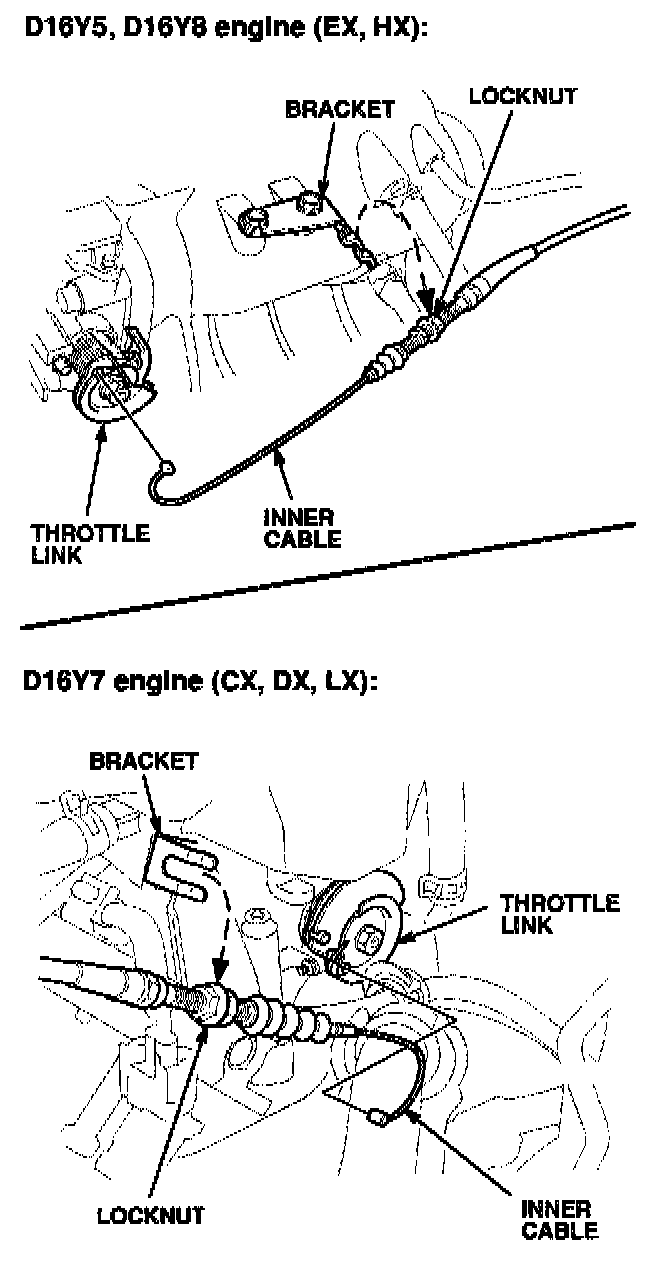 1. Loosen the throttle cable locknut, and remove the cable from the bracket. Detach the inner cable from the throttle link.