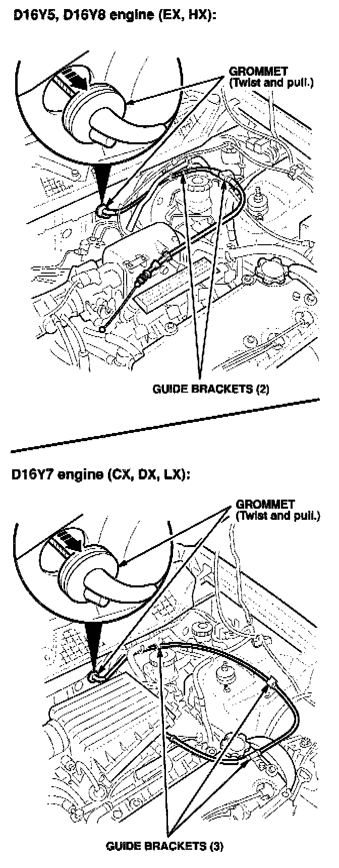 2. Remove the cable from the guide brackets, then twist and pull the throttle cable grommet out of the bulkhead.