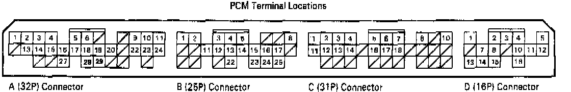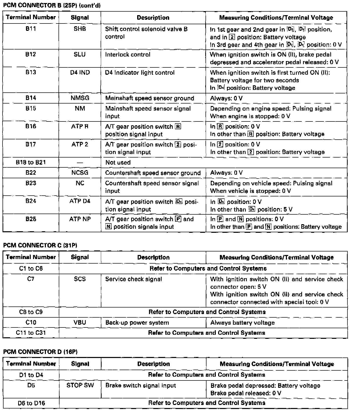 A/T Control System:The PCM terminal voltage and measuring conditions are shown for the connector terminals that relate to the A/T control system. The other PCM terminal voltage and measuring conditions are described under Computers and Control Systems/Normal Scan Data Values.